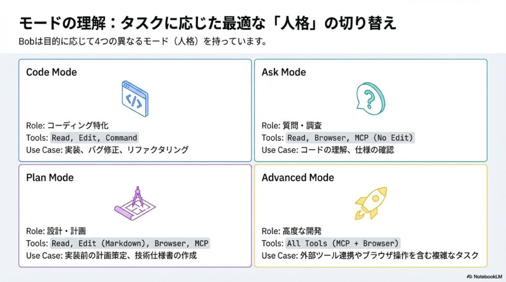 Bobには、タスクに応じて最適化された4つのモードがあります。これを使い分けるのが「Bob使い」への第一歩です。