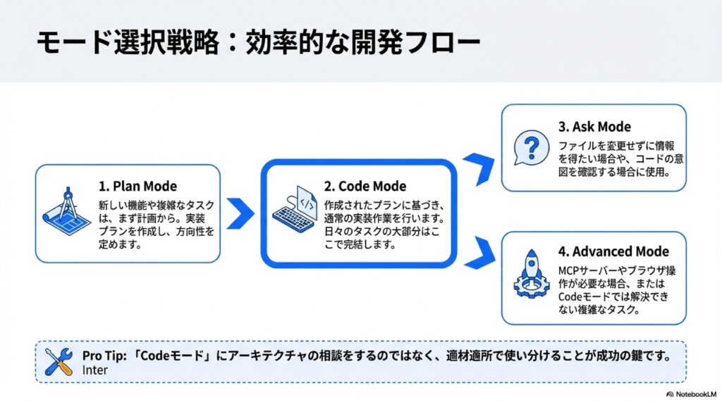 | Ask (質問) | 調査・学習 | ファイルを変更したくない時(コードリーディング中など)に使用。 |