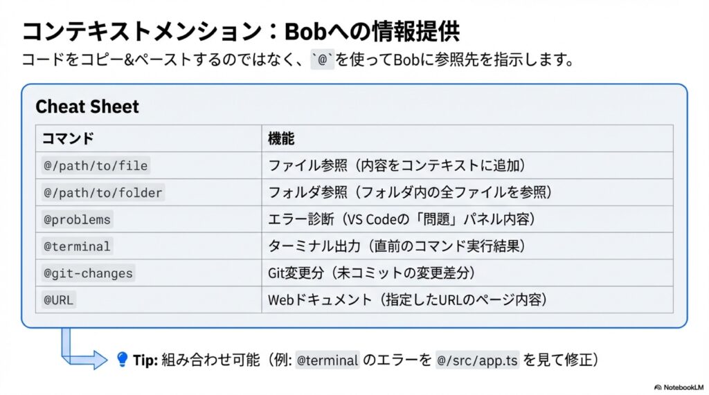 - 「@utils.ts を参考にして @service.ts のバグを直して」といったクロスリファレンスも可能です。