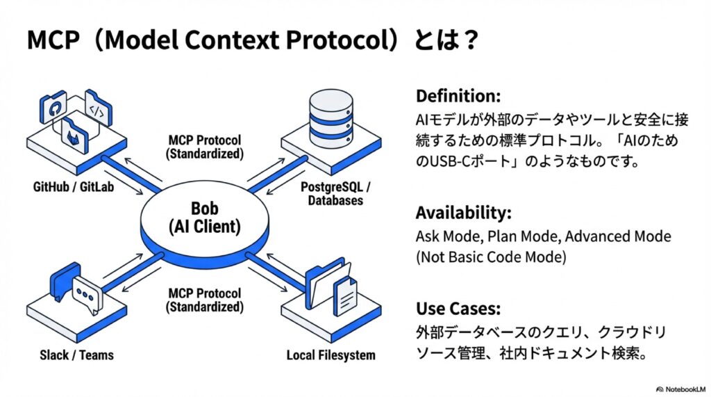 Bobは「MCP」というプロトコルに対応しています。これにより、Github、Slack、あるいは社内の独自データベースなど、外部ツールとBobを接続できます。「社内Wikiを検索して回答するBob」を作ることも可能です。